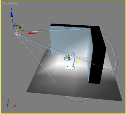 Як допоміжні джерела світла часто використовуються джерела типа Spot (Направлені). Щоб додати в сцену направлене джерело світла, перейдіть на вкладку Create (Створення) командної панелі, в категорії Lights (Джерела світла) виберіть рядок Standard (Стандартні) і Натисніть кнопку Target Spot (Направлений з мішенню). Створіть джерело світла таким чином щоб світло падало на сцену зверху, а мішень знаходилася в кутку, за лампою (рис 6.38)!