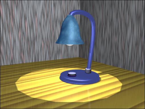 Мал. 6.35. Після третьої візуалізації видно, що світло падає від лампи Спочатку усунемо другу проблему. Щоб об'єкт Sphere (Сфера) не відкидав тінь, його необхідно виключити із списку об'єктів, з якими працює джерело світла. Для цього виділите джерело світла Omni (Всенаправленний), перейдіть на вкладку Modify (Зміна) командної панелі і в свитку настройок General Parameters (Загальні параметри) Натисніть кнопку Exclude (Виключити). В списку Scene Objects (Об'єкти сцени) вікна Exclude/Include (Виключити/Включити), що з'явилося, виділіть об'єкт Sphered і натисніть кнопку у вигляді подвійної стрілки. Об'єкт буде перенесений в список правої частини вікна (мал. 6.36). Натисніть клавішу F9, щоб ще раз візуалізувати сцену. Як видно на отриманому зображенні (мал. 6.37), тінь від об'єкту Sphere (Сфера) більше не падає, завдяки чому видна основа лампи. Тепер спробуємо розв'язати проблему затемненості більшої частини сцени. Для цього необхідно встановити допоміжне освітлення. Інтенсивність допоміжних джерел світла, яка задається за допомогою параметра Multiplier (Яскравість), обов'язково повинна бути значно менше ніж основного.