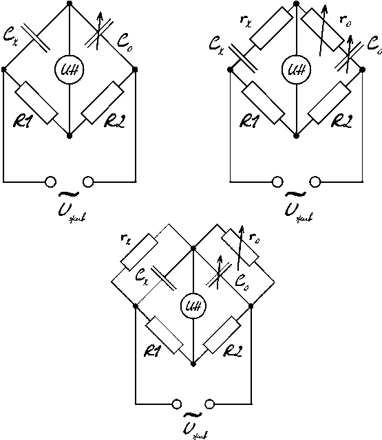 Схеми мостів змінного струму для вимірювання параметрів конденсатора а) для конденсаторів без втрат б) для конденсаторів з малими втратами в) для конденсаторів з великими втратами