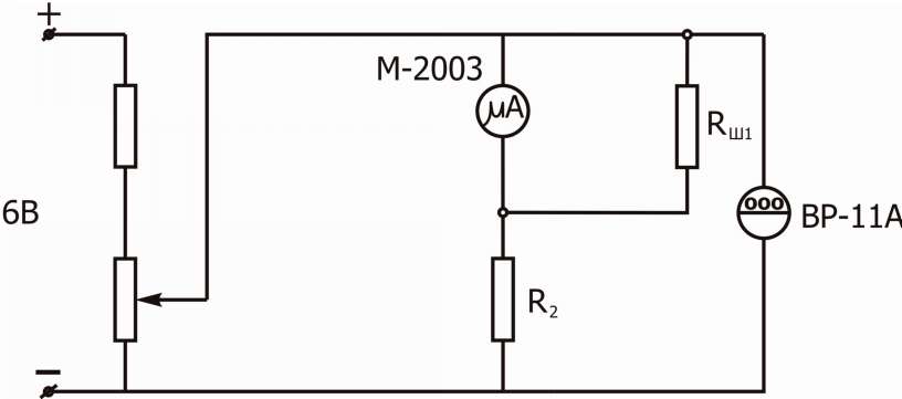 Завдання 1. Виміряти електричні величини за допомогою цифрового приладу – мультиметра ВР-11 А. 1.1. Ознайомитися з методикою вимірювання сили струму, напруги й опору мультиметром ВР-11А за його описом. 1.2. Виконати вимірювання опорів з набору для даної роботи і внутрішній опір мікроамперметра. 1.3. Виконати вимірювання постійної і змінної напруги на клемах джерел струму. 1.4. Результати вимірювань занести в зошит 1.5. Rш1 =, Rш2 =, Rш3 =, R2 =, RшА =, U_=, U ̰ = Завдання 2. Градуювання мікроамперметра для вимірювання постійного струму. Процесс градуювання полягає в зіставленні відхилень стрілочного приладу М-2003, який зашунтовано резистором Rш1 з показаннями мультиметра ВР-11 А, що використовується як еталонний прилад. 2.1. Зібрати схему, зображену на рисунку 1.