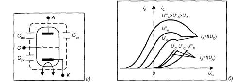 На рис. 13 приведена упрощенная схема усилителя на триоде и сеточная динамическая характеристика триода. При высоких частотах проходная емкость Сак создает большое реактивное сопротивление. Для уменьшения проходной емкости помещают экранную сетку Сэ между анодом и управляющей сеткой. Она экранирует электроды лампы от поля анода, ослабляя влияние Ua на Ia.