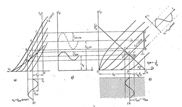 Рис. 10. Динамический режим работы триода. а – построение динамической характеристики в координатах I a - U c; б – эпюры анодного тока; в – построение динамической характеристики в координатах I a - U а.