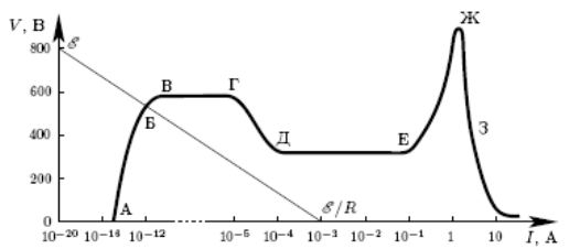 Электрический разряд в газах возникает при прохождении электрического тока через ионизированные газы. В зависимости от характера приложенного поля, от давления газа, формы и расположения электродов различают различные типы разрядов. При небольшом напряжении (≈ 100 В) через газ наблюдается прохождение тока (≈ 10-15 А). Видимо, этот ток обусловлен слабой ионизацией газа космическими лучами. Разряды в постоянном поле возникают при прохождении тока в газе и могут быть представлены в виде вольтамперной характеристики (рис. 1). На этой ВАХ выделяются участки: ОА – несамостоятельный разряд, АВ – развитие процесса пробоя (в точке В происходит пробой газового промежутка), участок ВГ соответствует темному таунсендовскому разряду, от точки Г до точки Ж происходит тлеющий разряд, причем падающая часть участка (ГД) называется поднормальным тлеющим разрядом, а часть ЕЖ – аномальным тлеющим разрядом. ЖЗ – переход к дуговому разряду.