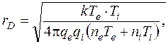 где k — постоянная Больцмана, h — постоянная Планка, Т — температура плазмы. В зависимости от величины α говорят о слабо, сильно или полностью ионизированной плазме. Различают высокотемпературную плазму с Т ≥ 106—108 К и низкотемпературную плазму с Т≤ 105 К. Существует два важнейших показателя, согласно которым свойства плазмы отличаются от свойств нейтрального газа: 1. Взаимодействие частиц в плазме определяется кулоновскими силами притяжения или отталкивания, а не только температурными процессами. Такое взаимодействие электрически заряженных частиц является коллективным. 2. Электрические и магнитные поля сильно действуют на плазму, формируя в ней электрические заряды и токи. Квазинейтральиостъ плазмы соблюдается в том случае, если линейные размеры области плазмы много больше дебаевского радиуса экранирования. Физический смысл дебаевского радиуса экранирования заключается в том, что он является пространственным масштабом в плазме (или полупроводниках), на котором экранируется поле заряженной частицы. Причиной экранирования какого-либо заряда является процесс преимущественного группирования заряженных частиц противоположного знака. Если заряженная частица с зарядом Zq создает электрический потенциал Фq, то дебаевский радиус экранирования rD определяется из выражения