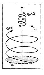 Рис. 2. Схема вращения электрона qe и положительного иона qi по ларморовской спирали