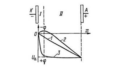 Рис. 3. Распределение потенциала между электродами при отсутствии разряда (1), в электронном приборе (2) и в газоразрядном приборе с тлеющим разрядом (3)