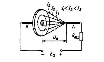 Этот режим возможен до тех пор, пока рабочая площадь катода меньше площади его полной поверхности. Когда разряд распространится на всю поверхность катода, то при дальнейшем увеличении напряжения E а ток начнет возрастать, но при этом, конечно же, площадь катода остается неизменной. В этом режиме увеличение числа электронов, выбиваемых из катода, возможно только за счет увеличения энергии ионов, бомбардирующих катод. А для этого необходимо повышение напряжения. Плотность тока катода растет. Сопротивление R огруже не уменьшается пропорционально току, и произведение i a R огр, т. е. падение напряжения на приборе, увеличивается. Наступает режим аномального катодного падения напряжения. Все же сопротивление R 0несколько уменьшается при возрастании тока, так как растет число ионов и электронов в единице объема газа. Но это уменьшение не такое сильное, как в режиме нормального катодного падения, поэтому напряжение U а увеличивается. Усиливается также яркость свечения газа, и оно распространяется все больше на обларть плазмы. В режиме аномального катодного падения работают газосветные лампы и различные ионные индикаторные приборы. Если продолжать увеличивать подводимое напряжение, ток и напряжение будут расти и в конце концов скачком возникнет дуговой разряд, который недопустим для приборов тлеющего разряда.