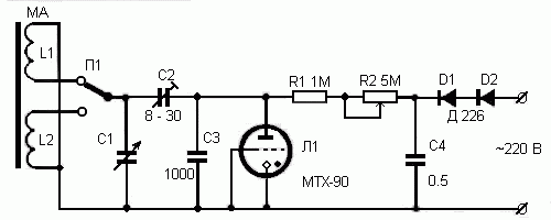 В данном генераторе колебательный контур образован катушкой L1 (или L2) и конденсатором С1. Роль источника возбуждающих импульсов выполняет генератор релаксационных колебаний на тиратроне МТХ-90. Управляющий электрод тиратрона соединен с катодом, то есть он работает как газоразрядный диод (динатрон). Такой газонаполненный диод обладает свойством: пока напряжение на его электродах мало (меньше так называемого напряжения зажигания), он не проводит электрического тока. Если увеличить напряжение, газовый промежуток диода пробивается и начинает проводить электрический ток. При этом ионизированный газ неон внутри тиратрона будет светиться характерным для него красным светом. Далее МТХ-90 сохраняет проводимость и при напряжениях, меньших напряжения зажигания. Разность между напряжениями зажигания и погасания может быть весьма большой - 20-150 в. Для того чтобы обеспечить прерывистое зажигание тиратрона, параллельно ему включен конденсатор С3. Он заряжается через резисторы R1 и R2 довольно медленно, а разряжается через тиратрон быстро. Ток, протекающий по резисторам R1 и R2 настолько мал, что не может поддерживать горение тиратрона. Когда напряжение на конденсаторе упадет ниже напряжения погасания, тиратрон погаснет. Конденсатор снова будет заряжаться. Меняя величину резистора R2, можно менять частоту «зажигания» тиратрона от 600 до 2000 раз в секунду. Вместе с конденсатором С3 заряжается и разряжается конденсатор С2. Он включен параллельно С3 через колебательный контур L1C1 или L2C1 (в зависимости от положения переключателя П). Когда загорается тиратрон, конденсатор С2 разряжается через контур; в контуре возникают затухающие электрические колебания. Этот процесс повторяется 600-2000 раз в секунду. Частота собственных колебаний контура зависит от величины индуктивности катушки L1 (L2) и емкости конденсатора C1. В данном случае (при величинах емкостей, указанных на схеме) она меняется в пределах 150-415 или 520-1600 кГц в зависимости от положения переключателя П1. Питание генератора производится от сети переменного тока напряжением 220 В через выпрямитель. Он собран по однополупериодной бестрансформаторной схеме.