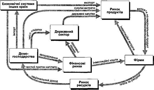 6. Відкрита економіка — це економічна система, яка пов'язана з іншими країнами світу механізмами експорту, імпорту і фінансових операцій. Оскільки в нашій моделі на мал. 1.4 зображено тільки грошові потоки (а не реальні), то: • експорт (X) як потік грошових платежів, а не товарів і послуг, зображено стрілкою, що направлена всередину системи, на внутрішні ринки продуктів; • платежі по імпорту (М) зображено стрілкою, що направлена із внутрішньої національної економіки за кордон. Імпортні товари і послуги купуються як домогосподарствами, так і фірмами та об'єктами державного сектора економіки. Проте з метою спрощення на мал. 1 зображено лише одну, найбільшу за обсягом категорію імпорту — імпорт споживчих товарів. • різниця між величиною грошових надходжень від експорту і величиною грошових платежів по імпорту називається чистим експортом (NX): NX=X-M; '
