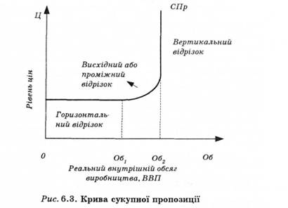 9. Сукупна пропозиція (СПр) — це шкала, графічно представлена у вигляді кривої, що показує рівень реального внутрішнього обсягу продукції, який буде вироблено за кожного можливого рівня цін та за інших рівних обставин. Вищий рівень цін створює для підприємств стимули виробляти і продавати більше товарів і послуг. При нижчому рівні цін обсяг виробництва зменшується. Крива сукупної пропозиції. В макроекономіці точиться полеміка з приводу форми сукупної пропозиції. Однак на цьому рівні аналізу ми вважатимемо, що вона складається із трьох відрізків: 1) горизонтального; 2) проміжного (висхідного); 3) вертикального. Форма цієї кривої відображає зміни, що відбуваються з витратами на одиницю продукції, коли реальний внутрішній обсяг виробництва зростає або зменшується. Витрати виробництва на одиницю продукції для конкретного обсягу продукції — це середні витрати на цей обсяг продукції (рис. 6.3):