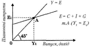 Якщо на графік моделі рівноваги накласти графік функції планованих витрат (рис. 25.3), то отримаємо так званий кейнсіанський хрест (рис. 25.5). Рівновага досягається в т.А, де перетинаються графіки планованих витрат і моделі рівноваги. У цій точці доходи дорівнюють планованим витратам. У кейнсіанському хресті важливу роль відіграють запаси фірм: приріст запасів має місце, якщо товарів вироблено більше, ніж споживачі захочуть купити. Зростання запасів є для фірм сигналом до зменшення виробництва і звільнення працівників. У результаті скорочується ВВП і доходи. Процес продовжується доти, доки доходи не стануть рівними планованим витратам, тобто не впадуть до рівноважного рівня. Скорочення запасів означає, що ВВП знаходиться нижче рівноважного рівня, тобто фірми виробляють менше товарів, ніж на них існує платоспроможний попит. Це служить сигналом до розширення виробництва, а отже, до зростання ВНП і доходів. Така ситуація зберігається доти, доки рівень доходу не зрівняється з планованими витратами.