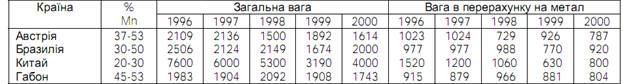 Світова здобич марганцю в 2010 році збільшилася на 33, 1% до 47, 2 млн.тонн. Найкрупнішими виробниками товарної марганцевої руди є Китай (близько 36%), ЮАР (13%), Австралія (12%), Габон (8%). У 2010 році світове виробництво марганцевих сплавів зросло на 25% до 14, 6 млн.тонн. Основну частку в світовому виробництві марганцевих сплавів займає силикомарганец з часткою у виробництві 59, 5% в 2010 році. Руди марганцю видобуваються, головним чином, відкритим способом; застосовуються також і підземні способи розробки. Основні обсяги видобутку зосереджені в 10 країнах світу (табл. 1.11). Щорічний світовий видобуток в 1996-2000 рр. становив від 1.7 до 24.3 млрд т. Таблиця 1.2. Світове виробництво руд марганцю, тис т [Jones, 2002]