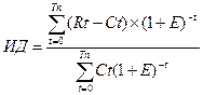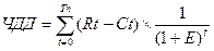 где Rt и Ct – результаты (денежные поступления) и затраты (денежные выплаты периода t; Тп – длительность жизненного цикла проекта в годах; Е – ставка дисконта;