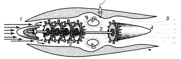 Якщо в реактивному двигуні є турбіна, як показано на рисунку 2.2, яка працює за рахунок енергії витікаючої струмини газів, і компресор, який всмоктує повітря і нагнітає його в камеру згоряння, то такий двигун називають турбокомпресорним. Під час запуску двигуна стартер починає обертати вал, на якому розміщені турбокомпресор 2 і газова турбіна 4. Через забірник 1 стискуване