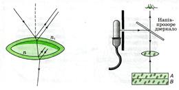 Рисунок 6.2 Рисунок 6.3 Нині усі фотоапарати випускаються з просвітленою оптикою. Контроль якості поверхонь. Залежність форми інтерференційних смуг від товщини тонких прозорих плівок використовується для контролю якості шліфування і полірування поверхонь. Якщо на поверхню досліджуваного виробу В накласти добре відполіровану скляну пластинку-шаблон А на рисунку 6.3, то між цією поверхнею і нижньою поверхнею шаблона утворюється тонка повітряна плівка, в якій можна спостерігати інтерференційну картину. Інтерференційні смуги утворюються у разі відбивання світла від верхніх поверхонь виробу і шаблона. Ці смуги спостерігаються через лінзу чи в мікроскоп. Інтерферометри. Інтерференційна картина дуже чутлива до різниці ходу інтерферуючих хвиль: мізерно мала зміна різниці ходу порядку частки довжини світлової хвилі викликає істотне зміщення інтерференційних смуг. На цьому ґрунтується дія інтерферометрів - приладів для точного вимірювання довжини і кутів хвиль, а також для визначення показника заломлення прозорих середовищ.