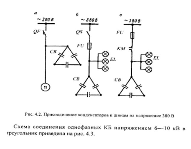 Схемы присоединения ККУ на напряжении до и выше 1 кВ.