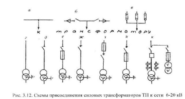 Ввод высокого напряжения в ТП осуществляется от радиальных и магистральных линий в цепь трансформатора (рис. 3.12, а, б, в); для удобства проведения ремонтных работ, профилактических испытаний кабельных линий — через ремонтные накладки (рис. 3.12, в) или через разъединители с двух сторон магистрали (рис. 3.12, б). Схема наиболее простого решения — глухое присоединение трансформатора к электрической сети (г). Такая схема в основном применяется при радиальных кабельных линиях небольшой протяженности, питающих ТП, выполн.КЛ. При расстоянии от200м и > от ТП до ИП станов-ся экономич-ки нецелесообразно передавать сигнал защиты по контрольным кабелям, сл-но, устанавливают перед тр-ром выключатель нагр-ки, кот.действ.на откл-е от газовой защиты. Установка на вводе подстанции коммутационных аппаратов (рис. 3.12, д, е, ж, з, и, к) необходима: а) практически во всех случаях при магистральных схемах соединения ТП; б) при питании ТП от ВЛЭП; в) по условиям защиты; г) при питании от пункта, находящегося в ведении другой эксплуатирующей организации; д) если пункт питания от ТП удален на значительное расстояние (3...5 км). На рис. 3.12, д приведена схема присоединения трансформатора к питающей его линии через разъединитель. Разъединитель позволяет отключать на напряжении 10 кВ холостой ход трансформатора мощностью до 630 кВА, на 20 кВ — до 6300 кВА, а также обеспечивает видимый разрыв в электрической сети. Наиболее простым и дешевым вариантом, при котором осуществляется индивидуальная защита трансформатора от токов короткого замыкания, является применение в цепи трансформатора разъединителя с плавкими предохранителями (рис. 3.12, е). При необходимости отключения трансформатора под нагрузкой со стороны высшего напряжения в ТП устанавливается выключатель нагрузки (рис. 3.12, ж, з, и). Если требуется защита трансформатора от токов короткого замыкания, то выключатель нагрузки устанавливается с предохранителями, которые обеспечивают селективное отключение поврежденного трансформатора ТП (рис. з, и). Выключатель нагрузки с предохранителями может устанавливаться в цепи трансформатора мощностью до 1000 кВА включительно с верхним (рис. з) или нижним (рис и) расположением предохранителей. Расположенные выше выключателя нагрузки предохранители (рис. з) локализуют в пределах данной камеры повреждения, которые могут возникнуть при оперативных переключениях, например. Такое расположение предохранителей обеспечивает безопасность осмотра и ревизии выключателя нагрузки при вынутых предохранителях. Недостатком схемы с верхним расположением предохранителей является необходимость выемки предохранителей под напряжением. При необходимости частых коммутаций в цепи трансформатора и в ответственных случаях применяется схема с выключателем высокого напряжения (рис. к). Совместно с выключателями на стороне высокого напряжения устанавливаются в двух крайних фазах измерительные трансформаторы тока и трансформаторы напряжения (как правило, два трансформатора типа НОМ, соединенные по схеме открытого треугольника, что дает возможность иметь все три напряжения). Измерительные трансформаторы используются как для питания цепей релейной защиты, так и для подключения контрольно-измерительных приборов. В двухтрансформаторной ТП для питания каждого трансформатора может применяться люба