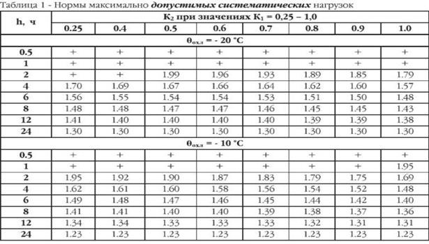 Допустимые систематические нагрузки не вызывают сокращения нормируемого срока службы трансформатора, так как за продолжительность графика нагрузки обеспечивается нормальный или пониженный против нормального расчетный износ изоляции. Допустимые аварийные перегрузки вызывают повышенный по сравнению с нормальным расчетный износ витковой изоляции, что может привести к сокращению нормированного срока службы трансформатора, если повышенный износ впоследствии не компенсирован нагрузками с износом витковой изоляции ниже нормального. Максимально допустимые систематические нагрузки и допустимые аварийные перегрузки масляных трансформаторов определяются в соответствии с таблицами 1, 2. В таблицах приведены значения K2 и h для суточного прямоугольного двухступенчатого графика нагрузки трансформатора при различных значениях K1 и 0охл значение K2 следует определять линейной интерполяцией.