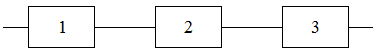 Указания к решению задачи. Необходимо нарисовать схему технического средства обеспечения жизнедеятельности человека с учетом схемы соединения элементов надежности. Вероятность безотказной работы технического средства обеспечения жизнедеятельности человека определить с учетом схемы соединения элементов надежности, при этом увеличение интенсивности отказов в конкретных условиях эксплуатации учесть путем умножения интенсивности отказов на соответствующий поправочный коэффициент. Пример выполнения. Система состоит из трех элементов, соединенных последовательно и имеющих одинаковую интенсивность отказов 2х10-7. Поправочный коэффициент на условия эксплуатации равен 7. Схема соединения имеет вид: