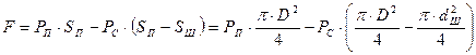 Это давление равно разности давлений на входе в дроссель и в левой полости цилиндра. Р=РН –РП – откуда давление, действующее на поршень РП=РН -Р РП=Па Составим уравнение равновесия сил действующих на поршень слева и справа. РП· SП=РС· (SП -SШ)+F Искомая сила F равна