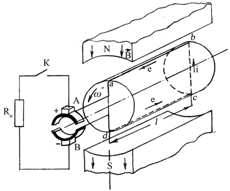 При вращении якоря в соответствии с законом электромагнитной индукции в проводниках витка ab и cd при пересечении ими магнитного поля будет индуктироваться ЭДС, которая при наличии стального цилиндра равна e = BLV где V – линейная скорость движения проводника относительно магнитного поля; B – индукция магнитного поля; L – длина активной части витка. Направления ЭДС в проводниках ab и cd определяется по правилу правой руки. По контуру abcd эти ЭДС складываются и, так как верхний и нижний проводники находятся в одинаковых магнитных условиях, то ЭДС витка будет: