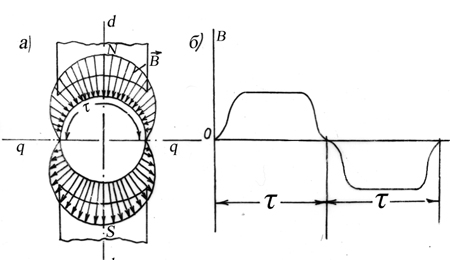 Таким образом, в данных условиях характер изменения во времени ЭДС в проводнике при вращении определяется характером распределения индукции в зазоре. Распределение ее по окружности якоря неравномерное, так как магнитное сопротивление Rμ потоку различное. Под полюсами индукция В имеет максимальное значение, в промежутке между полюсами индукция уменьшается, достигая на линии qq нулевого значения (рисунок 1.2, а). Линия dd, проходящая через центр якоря вдоль полюсов, называется продольной осью машины, а линия qq, проходящая через центр якоря посредине между полюсами, называется поперечной осью. Поперечную ось также называют геометрической нейтралью. Часть окружности якоря, приходящуюся на один полюс, называет полюсным делением и обозначают τ.