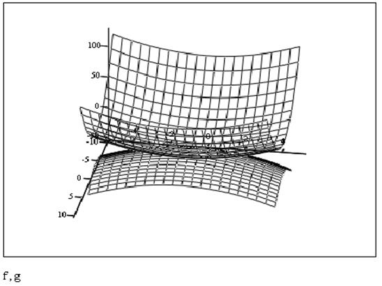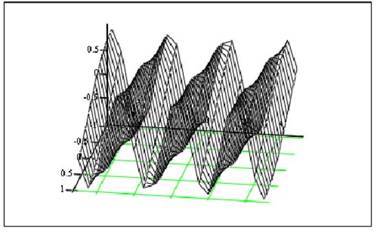 Проводя аналогию с построением двухмерной декартовой системы координат, логично предположить, что графическая область поверхности должна иметь три маркера для определения вида функции и ее переменных. На самом же деле маркер только один. В маркер графической области следует ввести имя заданной выше функции. Однако в отличие от двухмерного случая, прописан должен быть лишь непосредственно текст имени, без neременных в скобках. Это различие связано с тем, что трехмерный график должен быть задан через массив данных, содержащий численные значения координат по всем трем осям. Вполне очевидно, что матрица с числами никак не может быть одновременно и функцией двух переменных. При быстром же построении поверхности мы имеем дело с таким же массивом, дело с таким же массивом, как если бы просто набрали его вручную, единственное, параметры его определяются системой автоматически. Для рассматриваемой функции системой MathCAD будет нарисован график изображенный на рис.8.