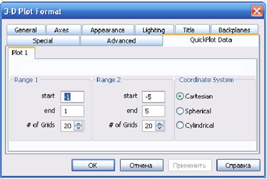 Для форматирования параметров графиков быстрого построения существу специальная закладка (Quick Plot Data)»Данные графика быстрого построения» окна форматирования трехмерных графиков 3D-Plot Format. Открывается это окно либо двойным левым щелчком мышью по графической области, либо при помощи комоды Format (Формат) ее контекстного меню (рис. 9).