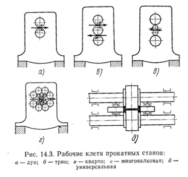 Прокатным станом называется комплекс машин и агрегатов, предназначенных для осуществления пластической деформации металла в валках (собственно прокатки), дальнейшей его отделки (правки, резки и пр.) и транспортирования. В связи с этим оборудование прокатного стана делится на три группы: 1) основное оборудование, входящее в главные линии или, что то же, линии рабочих клетей; 2) вспомогательное оборудование; 3) транспортное оборудование. В оборудование главной линии (рис. 14.2) входят рабочая клеть 4, передаточные механизмы 7...10 и электродвигатель 11. Основным агрегатом стана является рабочая клеть, состоящая из двух массивных вертикальных станин 2, установленных на плитовины 1, которые прикрепляются к фундаменту анкерными болтами. В верхней части станины соединены траверсой 3. В станинах смонтированы подушки с подшипниками и валками, в частности опорными 5 и рабочими 6. Валки, являясь основным рабочим инструментом стана, выполняют главную операцию прокатки— деформируют (обжимают) металл и придают ему заданную форму поперечного сечения. Валки могут иметь гладкую цилиндрическую поверхность в рабочей части; в этом случае они используются для прокатки листов. Для производства профилей (квадрат, уголок и др.) применяют калиброванные или сортовые валки, у которых на рабочей части (бочке) протачиваются углубления — ручьи в соответствии с формой прокатываемых изделий. Валки изготовляют из различных материалов: углеродистых сталей и чугунов, литейных и деформируемых высокопрочных сталей, чугунов повышенной прочности, легированных чугунов, легированных сталей, металлокерамических (твердых) сплавов. Прокатные станы классифицируются по числу и расположению валков в рабочих клетях, числу и расположению рабочих клетей и назначению станов. В зависимости от числа и расположения валков в рабочих клетях (рис. 14.3) прокатные станы делятся на пять групп: двухвалковые — дуо (а), трехвалковые — трио (б), четырехвалковые — кварто (в), многовалковые (г) и универсальные (д) соответственно. По назначению они разделяются на станы для производства полупродукта, станы готовой продукции и станы специального назначения. Первая группа включает обжимные станы (блюминги и слябинги) для получения полупродуктов крупного сечения и последующей их прокатки на сортовой или листовой металл. В эту группу входят и заготовочные станы для получения полупродуктов более мелкого сечения из блюмов или небольших слитков. По виду выпускаемой продукции станы второй группы делятся на сортовые, листовые и трубные.