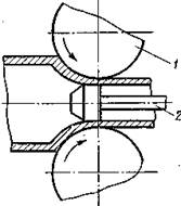 Полученная гильза прокатывается в трубу на автоматических раскатных станах. Валки 1 и оправка (дорн) 2 (рис. 14.5) обеспечивают раскатку гильзы. После прокатки трубы правят, подвергают термической обработке и т. п. Сварные трубы изготавливают в такой последовательности: формовка плоской заготовки в трубу, сварка трубы, отделка и правка. Для сварки труб применяют контактную сварку сопротивлением, электродуговую сварку под флюсом (трубы с прямыми и спиральными швами), аргонодуговую сварку (тонкостенные трубы).