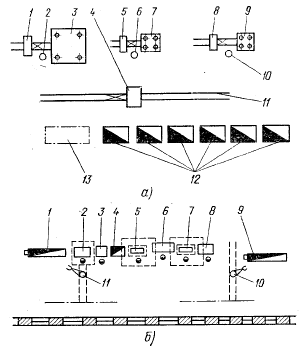 секунд, — перерабатывают крупные заготовки, в основном слитки. Прессы развивают усилия от 5 до 100 МН. Для ковки могут применяться также молоты механические, газовые и высокоскоростные. Механизация и автоматизация малопроизводительного процесса свободной ковки имеет большое значение. При ковке широко применяются механизмы и устройства, снижающие трудоемкость вспомогательных операций: мостовые краны, ковочные поворотные краны, лебедки, подвесные клещи, электротележки с поворотными столами, электрические кантователи, посадочные машины, манипуляторы и др. Посадочные машины относят к специальным манипуляторам, управляемым оператором. Применяют их в комплексах «нагревательная печь — ковочная машина» для загрузки и разгрузки заготовок, а также для транспортирования и установки их в рабочую зону оборудования. На рис. 15.3 показано взаимное расположение оборудования при обслуживании напольной посадочной машиной 4 (а) и подвесными посадочными машинами 10, и (б). Напольная посадочная машина загружает заготовки с промежуточного склада 13 в нагревательные печи 12, после нагрева передает их на поворотные столы 2, 6 и 10. В ковочные прессы 3, 7 и 9 заготовки подаются манипуляторами 1, 5, 8. Машина передвигается по рельсам 11. Две подвесные посадочные машины обслуживают технологическую линию из методической нагревательной печи 1, ковочного молота 2, гибочного пресса 3, камерной нагревательной печи 4, штамповочных молотов 5 и 7, обрезных прессов 6, 8 и печи для термической обработки поковок 9.