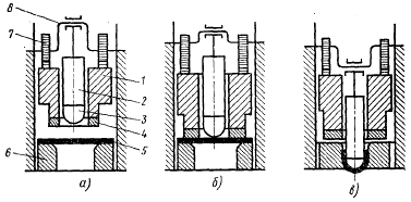 На кривошипных прессах двойного действия проводят вытяжку глубоких и сложных деталей. Пресс имеет два ползуна (рис. 15.16, и) -внутренний 2 и наружный 1. Оба ползуна находятся в верхнем положении, заготовка 5 укладывается на матрице 6. Первым движение вниз начинает наружный ползун, зажимающий прижимом 4 заготовку. К этому времени к заготовке подходит внутренний ползун с Рис. 15.16. Схема работы кривошипного пресса двойного действия: а — исходное положение; б —начало вытяжки; в — окончание вытяжки IV закрепленным на нем пуансоном 3 (рис. 15.16, б—начало вытяжки). Наружный ползун остается на месте, а внутренний, продолжая движение, производит вытяжку (рис. 15.16, 0—конец вытяжки). Первым движение вверх начинает внутренний ползун. Запаздывающее движение наружного ползуна способствует съему изделия с пуансона. Внутренний ползун приводится в движение от главного вала 8, а наружный — от кулачкового или коленно-рычажного механизмов 7, связанных с главным коленчатым валом. Прессы развивают усилия вытяжки до 10 МН, прижима — до 0, 5 МН. Имеются кривошипные прессы тройного действия. Гидравлические прессы для листовой штамповки также выпускаются простого или двойного действия. Листовая штамповка с целью получения качественных готовых деталей проводится в штампах, разделяющихся по технологическому признаку (гибочные, вытяжные и т. п.). Кроме того, штампы бывают одно- и многооперационные, последние подразделяются еще на штампы последовательного действия и совмещенные. Для изготовления рабочих частей штампов выбирают легированные стали (типа Х12, Х12М, ЭХВГ, ШХ15 и др.). В некоторых случаях для повышения стойкости штампов их рабочие части изготовляют из металлокерамических сплавов. Полосы и ленты в штампы подаются валковыми и другими механизмами, листы - механическими руками грузоподъемностью до 16 кг. Роботизированный технологический комплекс (РТК) в листоштамповочном производстве может быть организован на базе однокривошипного пресса простого действия (рис. 15.17). В состав РТК входят пресс 2, устройство поштучной выдачи заготовок 7, ПР 4, датчики внешней информации 5, система управления