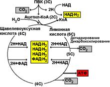 Процесс энергетического обмена можно разделить на три этапа: на первом, подготовительном этапе происходит пищеварение, то есть сложные органические молекулы расщепляются до мономеров, на втором происходит бескислородное окисление этих мономеров — гликолиз, и на последнем этапе происходит окисление с участием кислорода в митохондриях. Подготовительный этап. Под действием ферментов пищеварительного тракта или ферментов лизосом белковые молекулы расщепляются до аминокислот, жиры — до глицерина и карбоновых кислот, углеводы — до глюкозы, нуклеиновые кислоты — до нуклеотидов. Вся энергия при этом рассеивается в виде тепла. Гликолиз, или бескислородное окисление. Окисление глюкозы в клетках без участия кислорода происходит путем дегидрирования, акцептором Н служит кофермент НАД+. Реакции протекают в цитоплазме, глюкоза с помощью 10 ферментативных реакций превращается в 2 молекулы ПВК — пировиноградной кислоты и образуется восстановленная форма переносчика водорода НАД·Н2 никотинамидаденин-динуклеотида. При этом образуется 200 кДж энергии, 120 рассеивается в форме тепла, 80 кДж запасается в форме 2 моль АТФ: С6Н12О6 + 2АДФ + 2Н3РО4 + 2НАД+® 2 С3Н4О3 + 2АТФ + 2Н2О + 2НАД·Н2 + 120 кДж Дальнейшая судьба ПВК зависит от присутствия О2 в клетке, если О2 нет, происходит анаэробное дыхание, причем у дрожжей и растений происходит спиртовое брожение, при котором сначала происходит образование уксусного альдегида, а затем этилового спирта: I. С3Н4О3 ® СО2 + СН3СОН (уксусный альдегид) II. СН3СОН + НАД·Н2 ® С2Н5ОН + НАД+ У животных и некоторых бактерий при недостатке О2 происходит молочнокислое брожение с образованием молочной кислоты: С3Н4О3 + НАД·Н2 ® С3Н6О3 + НАД+ Третий этап энергетического обмена — кислородное окисление, или дыхание, происходит в митохондриях. Пировиноградная кислота проникает в митохондрии, происходит ее дегидрирование (отщепление водорода) и декарбоксилирование (отщепление углекислого газа) с образованием двухуглеродной ацетильной группы, которая вступает в цикл реакций, получивших название реакций цикла Кребса (рис. 299). Здесь происходит дальнейшее окисление, связанное с дегидрированием и декарбоксилированием. В результате на каждую разрушенную моль ПВК из митохондрии удаляется 3 моль СО2, образуется 5 пар атомов водорода, связанных с переносчиками (4 НАДН2, ФАДН2), а также моль АТФ. Суммарная реакция гликолиза и разрушения ПВК в митохондриях до водорода и углекислого газа выглядит следующим образом: С6Н12О6 + 6Н2О ® 6СО2 + 4АТФ + 12Н2 2АТФ образуются при гликолизе, две — в цикле Кребса; 2 пары атомов (2НАД·Н2)образовались при гликолизе, 10 пар — в цикле Кребса.
