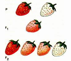 50% 50% Промежуточный характер наследования признаков при неполном доминировании. Явление доминирования не абсолютно, для огромного числа признаков характерно неполное доминирование в F1. И Мендель у гороха по ряду признаков отмечал неполное доминирование, при котором в гибридном поколении выражение признака является промежуточным. Например, при скрещивании гомозиготных красноплодных и белоплодных сортов земляники, все первое поколение гибридов получается розовоплодным. При скрещивании гибридов получаем расщепление в соотношении: 1/4 красноплодные (АА), 1/2 розовоплодные (Аа), 1/4 белоплодные (аа). Характерно то, что при неполном доминировании расщепление по генотипу соответствует расщеплению по фенотипу, так как гетерозиготы фенотипически отличаются от гомозигот.