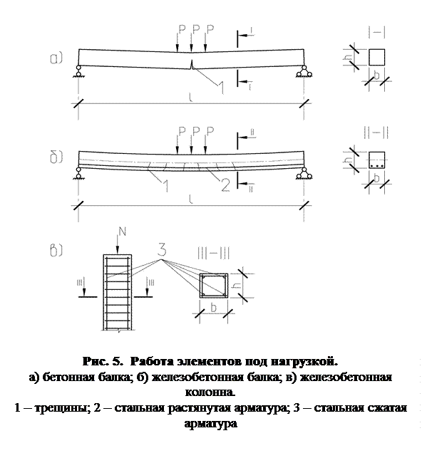 Сущность железобетона. Железобетон – это комплексный материал, в котором соединяются бетон и стальная арматура. Бетон хорошо сопротивляется сжимающим усилиям и во много раз (10-15 раз) хуже растягивающим, поэтому бетонные конструкции, в которых под нагрузкой возникает растяжение, имеют низкую несущую способность. Так бетонная балка разрушается при относительно малой относительно малой нагрузке вследствие образования трещин в растянутой зоне, тогда как прочность сжатой зоны не используется. Железобетонная балка, снабженная в растянутой зоне стальной арматурой, обладает несущей способностью во много раз большей, т.к. после образования трещин в бетоне растянутой зоны, растягивающие усилия воспринимаются арматурой. Стальная арматура хорошо сопротивляется не только растяжению, но и сжатию, поэтому арматуру рационально использовать и для усиления сжатого бетона. Примером такой конструкции является железобетонная колонна (рис. 5). Широкому применению железобетона в строительстве способствуют такие его качества, как долговечность, огнестойкость, стойкость против атмосферных воздействий, высокая сопротивляемость статическим и динамическим нагрузкам, способность задерживать радиоактивные излучения, возможность использования местного сырья для приготовления бетона (песок, гравий, щебень), небольшие эксплуатационные расходы.