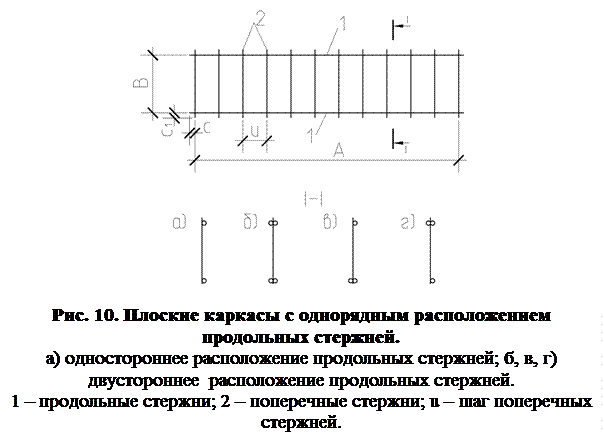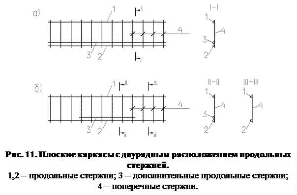 Рекомендуется применять каркасы с односторонним расположением стержней, т.к. в этом случае улучшаются условия сварки и сцепление арматуры с бетоном (рис. 11).