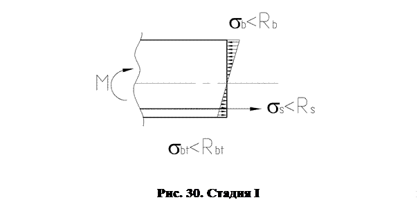 По мере увеличения нагрузки напряжения в элементе возрастают. Рассмотрим стадии напряженного состояния по нормальному сечению от начала загружения до разрушения элемента. Стадия I (рис. 30)