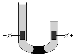 Рис. 4.12 Строение ДЭС: а) – по Гельмгольцу и Перрену, б) – по Гуи и Чепмену, в) – по Штерну. Вверху – схема расположения противоионов, внизу – зависимость потенциала от расстояния Предложенная Штерном модель строения ДЭС объединяет ранние модели, учитывая как адсорбцию противоионов, так и их тепловое движение. Согласно этой модели, являющейся в настоящее время общепринятой, часть противоионов находится на расстояниях порядка диаметра иона от поверхности ядра, образуя т.н. слой Гельмгольца (адсорбционный слой противоионов), а другая часть образует диффузный слой (т.н. слой Гуи). Потенциал диффузной части двойного электрического слоя называют электрокинетическим потенциалом (см. рис.4.12в). Электрокинетический потенциал обычно обозначают греческой буквой ζ (дзета) и называют поэтому дзета-потенциалом. Поскольку ζ -потенциал пропорционален заряду коллоидной частицы, агрегативная устойчивость золя пропорциональна его величине. Если поместить золь в постоянное электрическое поле, то, как и в растворах электролитов, заряженные частицы будут двигаться к противоположно заряженным электродам: коллоидная частица с адсорбированными на ней противоионами – в одну сторону, противоионы диффузного слоя – в другую. Сила, с которой электрическое поле действует на частицы и, следовательно, скорость движения частиц, очевидно, будет пропорциональна ζ -потенциалу. Движение частиц дисперсной фазы в электрическом поле называется электрофорезом. Явление электрофореза можно наблюдать, поместив в U-образную трубку какой-либо окрашенный золь, поверх которого налит не смешивающийся с золем бесцветный электролит. Если опустить в электролит электроды и наложить разность потенциалов, то граница окрашенного золя в одном из колен трубки будет подниматься, в другом – опускаться (рис. 4.13). Если поместить в U-образную трубку пористую перегородку (например, мелкий кварцевый песок) и заполнить её водой, то при наложении разности потенциалов в одном колене будет наблюдаться подъем уровня жидкости, в другом – его опускание (рис. 4.14). Движение дисперсной среды в электрическом поле относительно неподвижной дисперсной фазы (в рассмотренном случае – относительно поверхности пористых тел) называется электроосмосом. Явления электрофореза и электроосмоса получили общее название электрокинетических явлений.