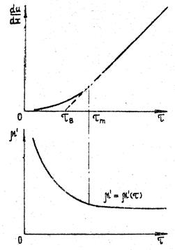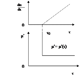 Рис.1. Линия консистентности и зависимость μ ’ от τ для пластической жидкости.