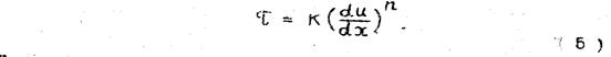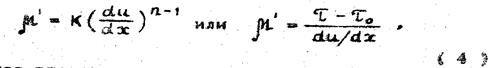 То же самое наблюдается и при течении растворов высокомолекулярных соединений с гибкими, свернутыми в клубок макромолекулами, например, у водных растворов полимеров. Здесь снижение вязкости обусловлено распрямлением молекул и ориентацией в направлении потока. Система ведет себя при течении как жидкость, в которой взвешены частицы, способные ориентироваться или деформироваться. Во всех этих случаях речь идет о кажущейся или эффективной вязкости, так как истинная вязкость жидкости от скорости течения не зависит. Механические свойства псевдопластической жидкости характеризуются двумя параметрами: динамическим напряжением сдвига предельного разрушения структуры или ориентирования частиц в потоке τ m (рис.3). Реологическое уравнение у таких систем выражают в виде степенной зависимости