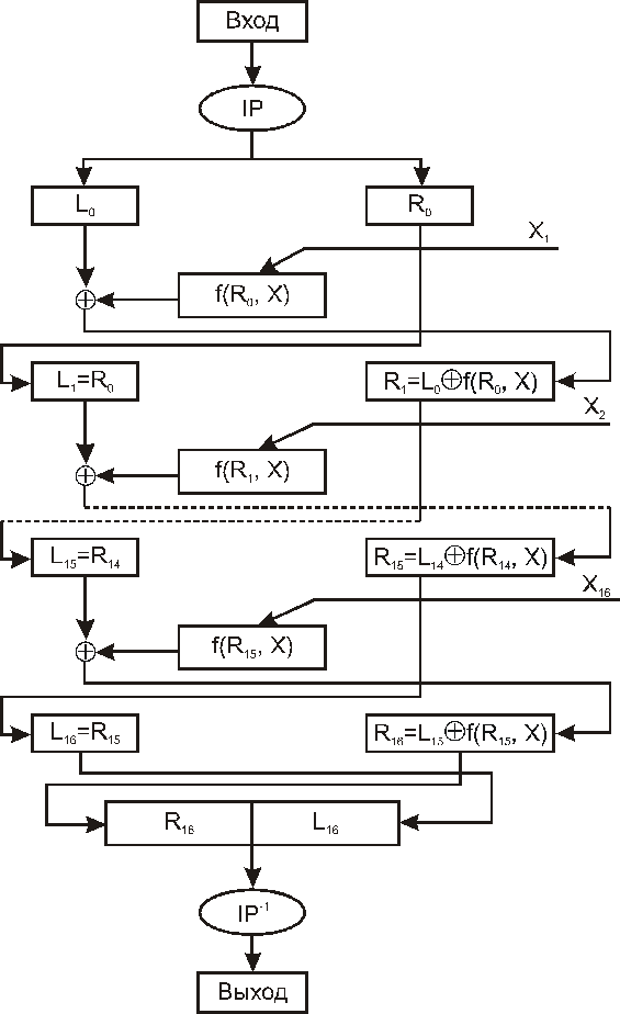 Рассмотрим принцип работы блочного шифра. Входом в блочный шифр и результатом его работы является блок длины n — последовательность, состоящая из n бит. Число n постоянно. При необходимости шифрования сообщения длиной, большей n, оно разбивается на блоки, каждый из которых шифруется отдельно. Различные режимы работы связаны с дополнительными усложнениями блочного шифра при переходах от блока к блоку. В стандарте DES длина блока n = 64. В режиме ECB шифрование блока открытого текста В производится за 16 однотипных итераций, именуемых циклами. Схема преобразования приведена на рис. 1.1. Блок рассматривается как конкатенация (сцепление) двух подблоков равной длины: B = (L, R). На каждом цикле применяется свой ключ (Xi), обычно вырабатываемый из некоторого основного ключа (X). Ключи, используемые в циклах, называются подключами. Основным элементом шифра является несекретная цикловая функция вида Y = f(R, X). Входом в цикл является выход из предыдущего цикла. Если упомянутыйвход имеет вид (L, R), то выход имеет вид (R, L Å f(R, X)), где Å — поразрядное сложение помодулю 2. Например, длявыхода циклас номером i это означает: Ri = Li-1 Å f(Ri-1, Xi), Li = Ri-1 (i = 1, …, 16). В режиме ЕСВ алгоритм DES зашифровывает 64-битовый блок за 16 циклов. Биты входного блока перед первым циклом переставляются в соответствии с табл. 1.1 в ходе так называемой начальной перестановки (IP — initial permutation). После выхода из последнего цикла L и Rпереставляются местами, после чего соединяются в блок. Биты полученного блока снова переставляются в соответствии с перестановкой IP-1, обратной начальной. Результат принимается в качестве блока шифртекста.