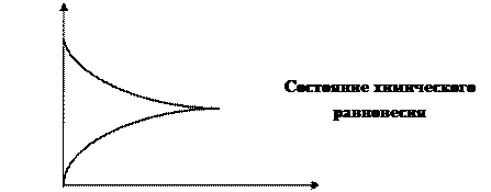 где k прями k обр - константы скорости, соответственно, прямой и обратной реакций. В начальный момент времени (см. рис. 6.2) концентрации исходных веществ [A] и [B], а следовательно, и скорость прямой реакции имеют максимальное значение. Концентрации продуктов реакции [С] и [D] и скорость обратной реакции в начальный момент равны нулю. В ходе реакции концентрации исходных веществ уменьшаются, что приводит к снижению скорости прямой реакции. Концентрации же продуктов реакции, а, следовательно, и скорость обратной реакции возрастают. Наконец, наступает момент, при котором скорости прямой и обратной реакций становятся равными. Состояние системы, при котором Vпрям = Vобр называется химическим равновесием. Это равновесие является динамическим, поскольку в системе имеет место двусторонняя реакция - в прямом (A и B - реагенты, C и D - продукты) и в обратном (A и B - продукты, C и D - реагенты) направлениях. V реакц.