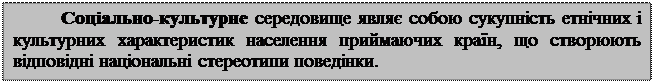 Під культурою розуміють домінуючу в суспільстві систему цінностей, вірувань, звичаїв і установок. Кожне суспільство має свою культуру, яка вливає на стиль повсякденного життя. Особливий інтерес становить урахування національних стереотипів у діяльності міжнародного менеджера. 1. Американський національний стереотип (США): 1. Жорсткий прагматизм, орієнтація на реальну справу, що приносить користь, повага і прагнення до матеріального достатку і заробляння грошей. 2. Цільовий динамізм («ціль — дії — досягнення — нова ціль. 3. Американець виключно з повагою ставиться до часу і тим більше до часу як найважливішого ділового ресурсу. 4. Глибокий індивідуалізм і впевненість у тому, що лише ти сам можеш все зробити для себе і, відповідно, виняткова самостійність у прийнятті і реалізації рішень, рівно як і повна готовність нести за них усю необхідну відповідальність. 5. Ставлення до інших людей і комунікативні риси характеризуються загальною дружелюбністю, відвертістю і щирістю, готовністю до співробітництва і пошуку розумних компромісів. 6. Жорсткий розподіл ділового й особистого в американській діловій практиці і поведінці взагалі. 7. В американцях досить часто цілком зрозумілий патріотизм і гордість за успіхи і становище США у світі переходять у певні прояви етноцентризму. 2. Англійський національний стереотип: 1.Прагматичність, орієнтація на справу і дію, життєвий здоровий глузд. При цьому англійців не спостерігається американської пристрасті до грошей і збільшення доходу як головного мірила життєвих досягнень. 2.Нелюбов до абстрактних проектів, за якими не стоїть реальної справи. 3.Почуття власної гідності: саме воно підводить до усвідомлення необхідності дотримання етичних норм і загальноприйнятих традиційних правил, навіть якщо ці норми і правила не записані у жодних законах.. 4. Глибока повага до традицій національних, державних, сімейних та ін. 5.Певний етноцентризм, але порівняно з американським він більш прихований, винятково коректний. 3. Французький національний стереотип: 1) Інтелектуалізм, любов до мистецтва, гармонії і краси цікаво проявились у сфері ділового життя. 2) Побоювання і нерішучість у сфері реалізації і практичного виконання всього задуманого на папері. 3) Нелюбов до компромісів і більша, ніж інших націй, схильність до конфліктів і спорів під час вирішення різних проблем. 4) Щодо особистих рис, їх манери і стилю спілкування, поведінки в сім'ї та особистому житті взагалі, то тут діє ефект компенсації, тобто ніхто так не розкутий, вільний від умовностей, природний і відрізняється гумором і винахідливістю в неофіційній обстановці на противагу строгим схемам, законам і регламентам у діловому та офіційному житті.