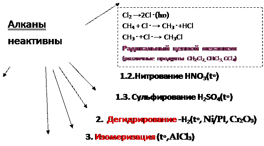 Радикал - частица, несущая свободный электрон, обладатель высокой реакционной активностью и короткой самостоятельной жизнью. (заряд = 0) Изомерия · Структурная (Углеродного скелета) Физические свойства · Горят · Запах нефти, нет вкуса · H2O не растворяются, но хор. растворимы в орган. растворителях C1-C4 – Газ C5-C15 –Жидкость C16 – Твердое вещество Химические свойства Особые реакции 1) Пиролиз 2CH4 → C2H2 + 3H2 (1500◦ ) 2) С H3- С H2-С H2-С H3 +O2 → 2C H3-COOH+ H2O (kat) Кислород воздуха