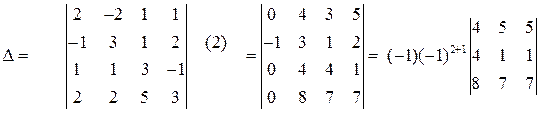 б) Решение. Решение найдем разложением по первому столбцу, но сначала с помощью свойств определителя сделаем нули в этом столбце везде кроме элемента, равного минус единице. Для этого элементы второй строки умножим на два и прибавим к соответствующим элементам первой строки; элементы второй строки прибавим к соответствующим элементам третьей строки; элементы второй строки умножим на два и прибавим к соответствующим элементам четвертой строки. Эти действия записываем так: