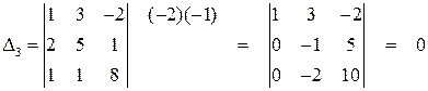 Разложив определитель 4-го порядка по 1-му столбцу, свели его вычисление к нахождению одного определителя 3-го порядка, который можно вычислить по правилу диагоналей, разобранному выше. Можно дальше применить свойства определителя и свести этот определитель к одному определителю 2-го порядка. Продолжаем делать нули теперь уже во второй строке, умножая элементы третьего столбца на