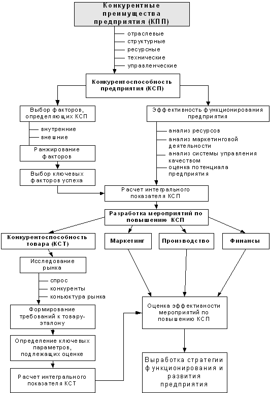 Понятие конкуренции является сложным и многогранным. Определение наиболее известного исследователя конкуренции М.Портера: «Конкуренция – динамичный и развивающийся процесс, … непрерывно меняющийся ландшафт, на котором появляются новые товары, новые пути маркетинга, новые производственные процессы и новые рыночные сегменты… В конкуренции главную роль играют инновации и перемены». Из этого определения следует, что конкуренция – динамичное состояние рыночной среды, которое заставляет ее участников совершенствовать свою продукцию и деятельность. Таким образом, М.Портер определяет конкуренцию как двигатель прогресса. Конкурентное преимущество, рассматриваемое как совокупность свойств товара, которые создают для фирмы определенное превосходство над конкурентами (миссия, имидж, уровень культуры, качество системы менеджмента и др.), может обуславливаться различными факторами. С другой стороны, конкурентное преимущество может увеличивать рыночную силу и, тем самым, оказывать влияние на состояние экономической конъюнктуры. Интегральный показатель конкурентных преимуществ, например, товара, характеризует его потенциальную конкурентоспособность. С достаточно полной классификацией конкурентных преимуществ различных объектов можно ознакомиться в книге [2, с. 453]. Понятие конкурентоспособности трактуется в литературе весьма неоднозначно. В общем виде конкурентоспособность – это свойство объекта и его сервиса, характеризующееся степенью реального или потенциального удовлетворения им конкретной потребности по сравнению аналогичными объектами, представленными на данном рынке. Конкурентоспособность предприятия может быть определена как ее сравнительное преимущество по отношению к другим предприятиям данной отрасли внутри национальной экономики и за ее пределами. Конкурентоспособность отражает продуктивность использования ресурсов. Принцип справедлив как на уровне отдельного предприятия, так и на уровне экономики страны в целом. Исходя из него, можно утверждать, что для обеспечения конкурентоспособности предприятие должно постоянно заботиться о наиболее полном и эффективном использовании имеющихся в ее распоряжении ресурсов, а также приобретаемых для будущего производства всех видов ресурсов. Конкурентоспособность фирмы может быть обнаружена (оценена) только в рамках группы фирм, относящихся к одной отрасли, либо фирм, выпускающих товары-субституты. Таким образом, конкурентоспособность фирмы – понятие относительное, которое определяется, как способность обеспечить лучшее предложение по сравнению с конкурирующей компанией. Прежде чем переходить к подробному анализу и оценке конкурентоспособности предприятия необходимо выработать план действий. На рис. 1 приводиться алгоритм, который в конечном итоге позволит повысить конкурентные преимущества предприятия. Наиболее сложным является оценка степени конкурентоспособности, т.е. выявление характера конкурентного преимущества фирмы по сравнению с другими фирмами. При этом возникает несколько проблем: 1. Выбор базовых объектов сравнения, т.е. выбор фирмы-лидера в отрасли страны или за ее пределами. Такая фирма-лидер должна обладать определенными параметрами, чтобы такое сравнение было корректным. К таким параметрам относятся: · соизмеримость хара