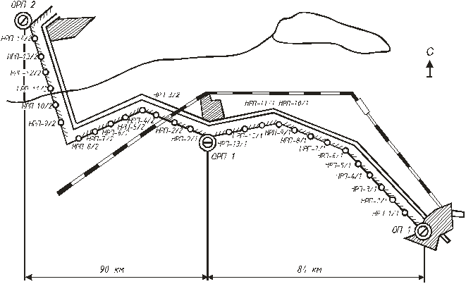 Выбор трассы линии передачи определяется, прежде всего, географическим расположением пунктов, между которыми должна быть организована связь. Выбранный вариант трассы ЛП должен обеспечивать минимальные затраты и наибольшие удобства при эксплуатации. В пояснительной записке должны быть перечислены требования, предъявляемые к трассе кабельной линии связи. В соответствии с заданием на курсовое проектирование необходимо выбрать основной и альтернативный варианты, т.к. при реальном проектировании могут возникнуть непредвиденные препятствия. Привести ситуационный план трассы. Пример ситуационного плана трассы кабельной линии приведен на рисунке 1.