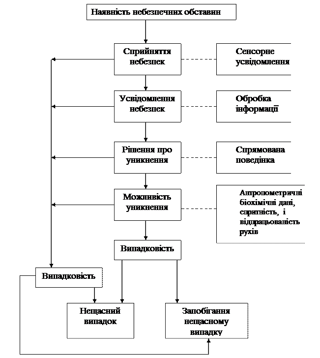 Мал. 2. Ступенева логіко-імітаційна модель виникнення нещасного випадку. Поділення факторів на вражаючі, небезпечні і на шкідливі досить умовне. Один і той же фактор може викликати смерть, погіршення здоров'я, або не подіяти на людину взагалі. Таксономія небезпек - класифікація та систематизація явищ, процесів, інформації, об'єктів, які здатні завдати шкоди людині. Класифікація небезпек: а), за походженням - природні, техногенні, екологічні; б), за локалізацією - космос, атмосфера, літосфера, гідросфера; в), за сферою проявлення - виробнича, транспортна, побутова, спортивна; г). за наслідками - загибель, травми, захворювання, зниження працездатності. Ідентифікація небезпек - знаходження типу небезпеки та встановлення її характеристик, необхідних для розробки заходів щодо її усунення чи ліквідації наслідків. Номенклатура небезпек - перелік назв, термінів, систематизованими за окремими ознаками. Квантифікація небезпек - введення кількісних характеристик для оцінки рівня небезпеки. Найпоширенішою кількісною оцінкою небезпеки є ступінь ризику. Безпека життєдіяльності становить фундамент для розвитку інших дисциплін, що розглядають «людський фактор»: - охорона праці, фізіологія праці, психологія праці, гігієна праці; - цивільна оборона вивчає заходи, що проводяться для захисту населення в умовах надзвичайних ситуацій мирного та воєнного часу; - екологія та соціоекологія - науки про взаємовідношення людства та природного середовища.