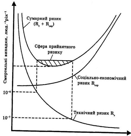 На мал. З наведено спрощений варіант визначення прийнятного (допустимого ризику). При підвищенні витрат на удосконалення обладнання технічний ризик знижується, але зростає соціальний. Сумарний ризик має мінімум, коли створено необхідне співвідношення між інвестиціями в технічну і соціальну сферу. Ці обставини треба ураховувати під час вибору прийнятного ризику. Рівень прийнятного ризику за міжнародною домовленістю вирі-шено рахувати в межах 10"...10" (смертельних випадків люд" -рік"), а величина 10" є максимально прийнятим індивідуальним ризиком. Досягнути «нульового» ризику не можливо. Якщо витрати на зменшення ризику в одній області збільшувати, то грошей на зменшення ризику в іншій області буде не вистачати і в цієї області ризик буде збільшуватися. Наприклад: розглянемо загальний ризик в технічній області і в соціально-економічній, в умовах обмеженого фінансування. Якщо збільшувати фінансування в технічній сфері, наприклад, для удосконалення автомобіля - змінити шини, удосконалити гальмуючі пристрої, вбудувати подушки безпеки та інше, то в умовах обмеженого фінансування, зменшуються витрати в соціально-економічній сфері: погіршиться навчання водіїв, контроль за станом їх здоров'я, медичне обслуговування, поліпшення умов праці і ризик в цій області зросте. Визначити мінімальний (min), тобто сумарний ризик можна за допомогою математичних методів: